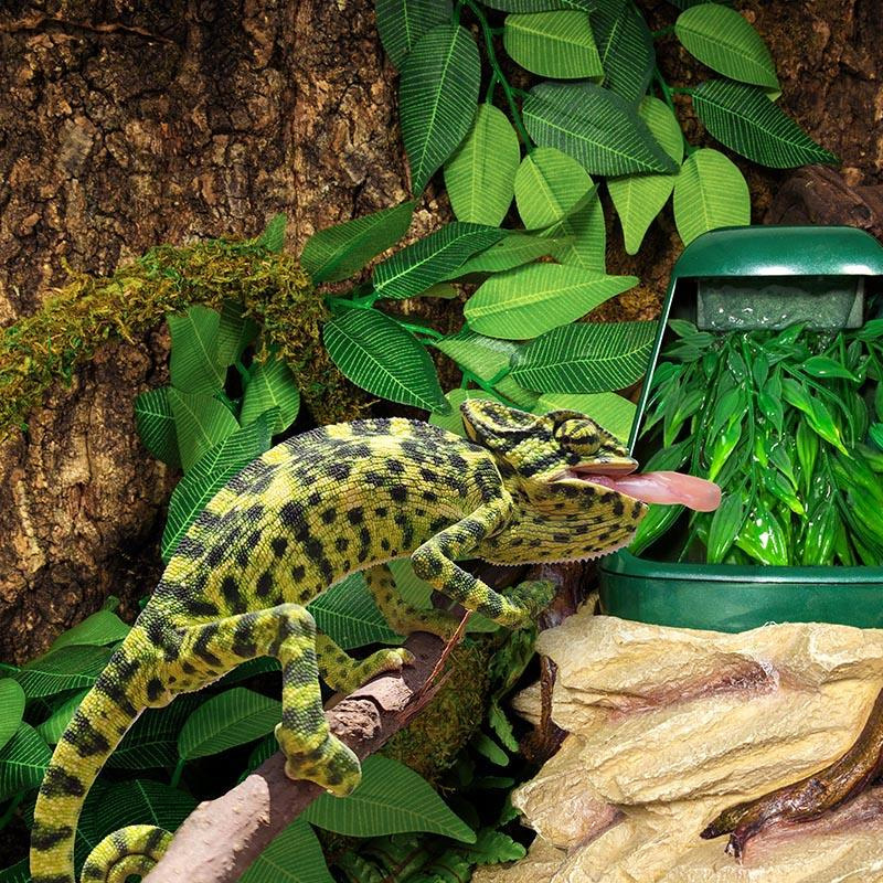 GOUTTEUR SUR FEUILLESL'eau qui tombe de la feuille simule le milieu de vie naturel des reptiles. |