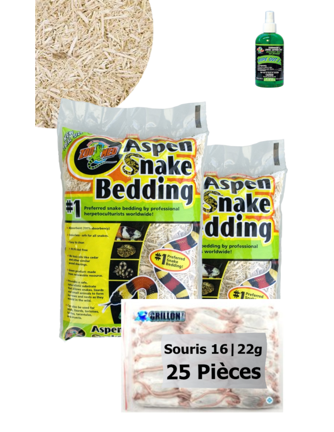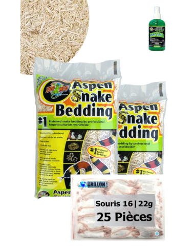 TOP Affaire - Petits serpents : 2 sacs Litière Aspen 4.4L + 25 souris 16-22g | 1 Wipe Out désinfecte