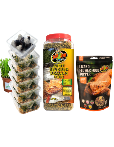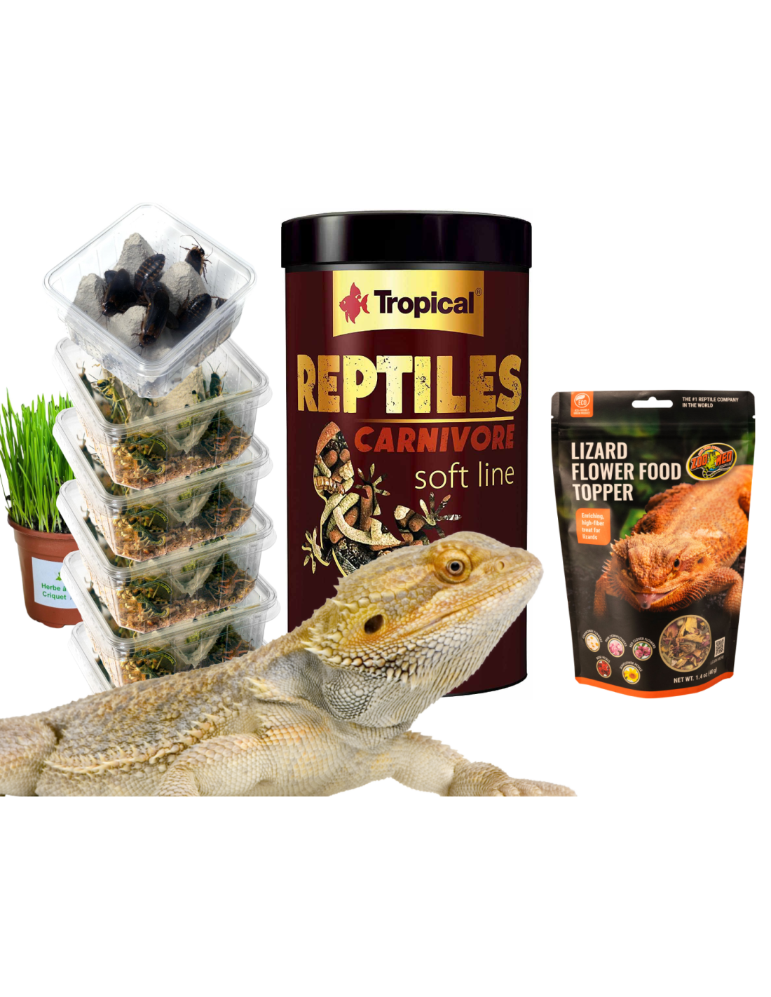 Menu Pogona Adultes : Pack Complet 1 mois, Criquet et Dubia Subadultes, Granulés et Complément Floral Zoo Med